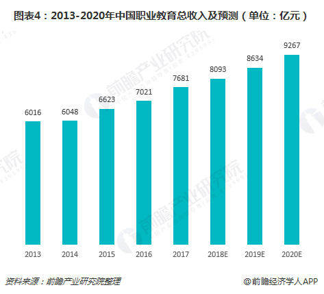 最后,在职业教育方面,我国职业教育市场发展已趋于成熟,但仍保持稳定增长态势。根据弗若斯特沙利文的数据,我国职业教育市场总收入已由2013年的6016亿元增至2017年的7681亿元,年复合增长率达到6.3%;预计到2020年,职业教育市场总收入将达到9267亿元。