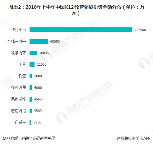 再来看K12教育,在中高考升学环境下,中国K12教育市场近年来表现亮眼,深受资本青睐。2018年上半年,K12教育领域融资金额达到31.9亿元人民币,仅次于语言教育领域。其中,作业平台领域获投金额最多,总额达到22.75亿元,远超其他细分领域。