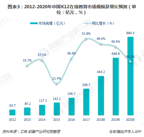 在资本助推下,2012年以来,K12在线教育市场规模基本保持30%以上的高增长,即使在2015年降至21.4%后也能够快速反弹,在2017年攀升至51.8%的新高位,相应的市场规模达到298.7亿元;预计到2020年,K12在线教育市场规模将达到884.3亿元。