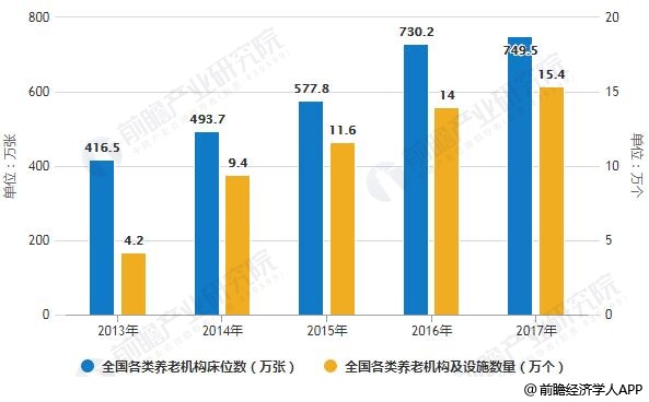 3、除此外,现在的养老机构和配套设施都较为落后,而老年人的消费能力却在不断上升,二者的不匹配导致养老公寓的供给仍然不足。根据前瞻产业研究院发布的《中国养老公寓行业发展前景与投资战略规划分析报告》统计数据显示,截至2017年底,全国养老机构和设施总数为15.4万个,各类养老床位合计749.5万张;从老龄人口以及市场供应的养老床位来看,每千名老年人拥有养老床位31.1张。