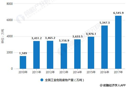 近年来,随着我国经济总量不断扩大,工业危险废物产量也出现明显增加。2010年全国工业危险废物产量已达1589万吨,2012年全国工业危险废物产量增长至3465.2万吨,2013年有所下降,之后继续增长,到了2016年全国工业危险废物产量达到5347.3万吨,较上年同比增长34.49%。截止到2017年全国工业危险废物产量达到突破6500万吨。但有效处理量不足,危险废物处理水平有待提高。