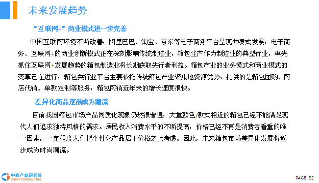 随着中国居民可支配收入增长、国内、境外的旅游需求崛起,箱包行业也将保持良好增长趋势。另一方面,电子商务、互联网+的商业创新模式正在深刻影响传统制造业,箱包网销近年来的增长速度很快。箱包行业是一个充满朝气的快速消费性行业,市场发展前景看好。