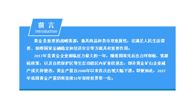 2017年是黄金企业面临压力最大的一年,随着国家先后出台环保税、资源税政策,以及自然保护区等生态功能区内矿业权退出,部分黄金矿山企业减产或关停整改,黄金产量自2000年以来首次出现大幅下滑。即便如此,2017年我国黄金产量仍将连续11年保持世界第一位。2017年全国黄金实际消费量1089.07吨,同比增长9.41%。黄金首饰、金条销售和工业用金量继续保持增长趋势,仅金币销售量出现了下跌。