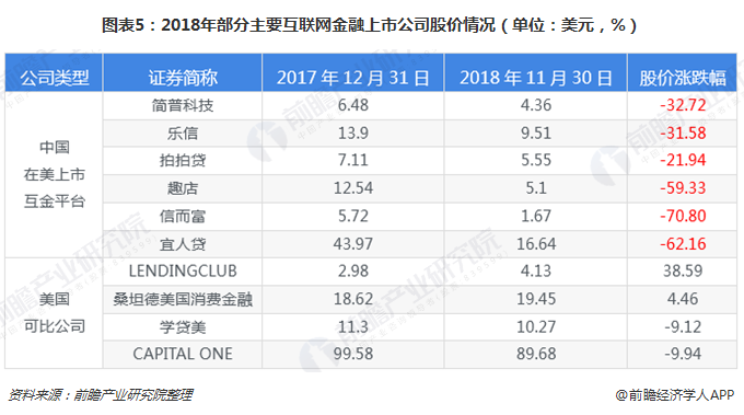 此外,从我国互联网金融公司的股价来看,对比2018年11月30日和2017年12月31日两个时点的收盘价,中国互金平台股价跌幅在20-70%之间;而与此同时,美国可比上市公司的股价波动则在-10%和50%之间。可见,在美互金中概股的深跌,原因不在美国股市,而在中国国内行业层面的转折与变化,而这主要是受国内监管政策趋严的影响。