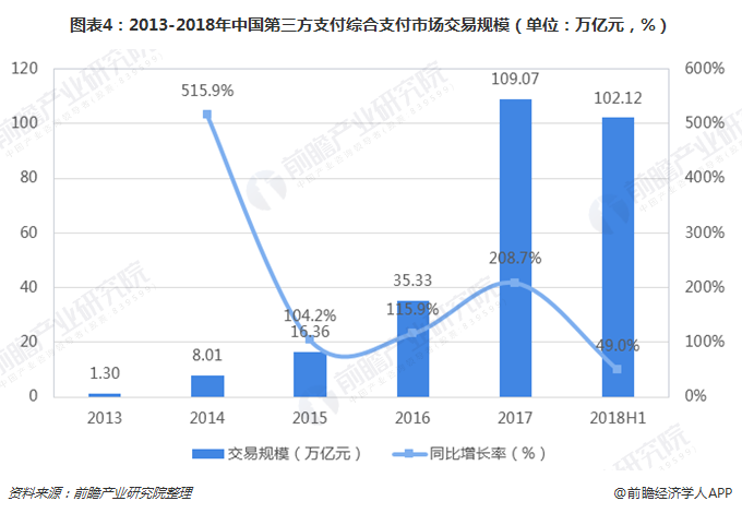 而除了P2P机构度日艰难以外,第三方支付机构的日子也不好过。备付金集中存管政策的实施直接消灭了支付机构的备付金利息收入,留下了近百亿的盈利缺口,盈利结构转型迫在眉睫。对于较大型机构来说,这些机构再也不能任性地“免费补贴”C端用户而获得用户规模;而对于部分规模较小、盈利渠道单一的机构而言,则因收入来源被截将直接面临生存问题。从第三方支付交易规模来看,2018年行业增速已经明显下降,预示行业发展正面临一定的发展阻碍。