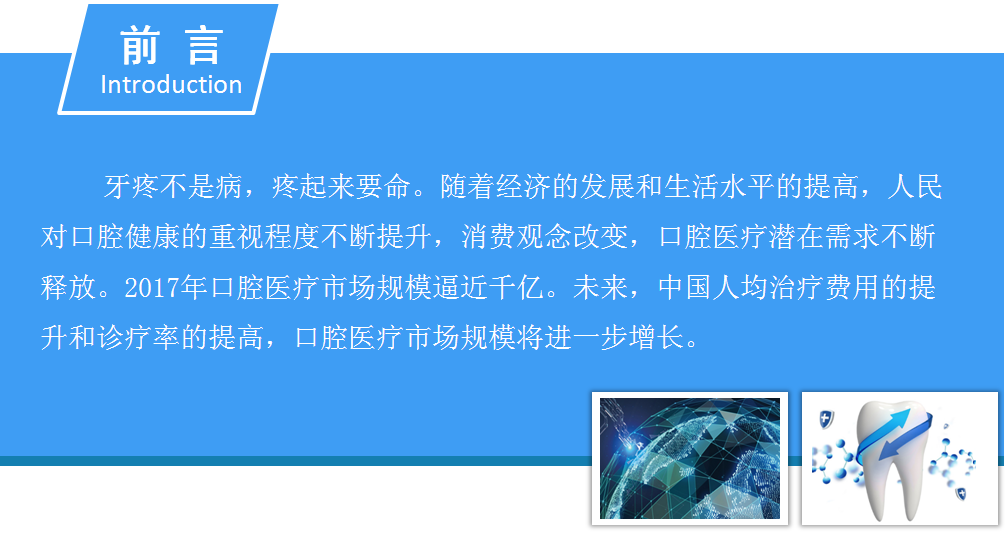 牙疼不是病,疼起来要命。随着经济的发展和生活水平的提高,人民对口腔健康的重视程度不断提升,消费观念改变,口腔医疗潜在需求不断释放。2017年口腔医疗市场规模逼近千亿。未来,中国人均治疗费用的提升和诊疗率的提高,口腔医疗市场规模将进一步增长。