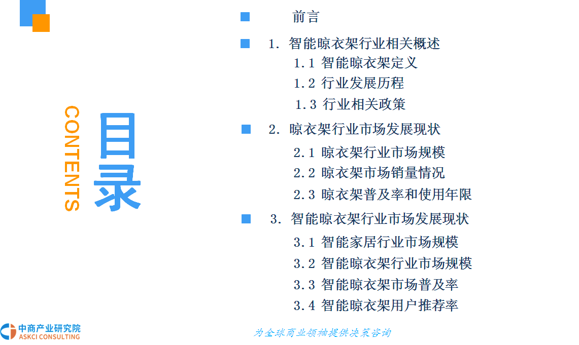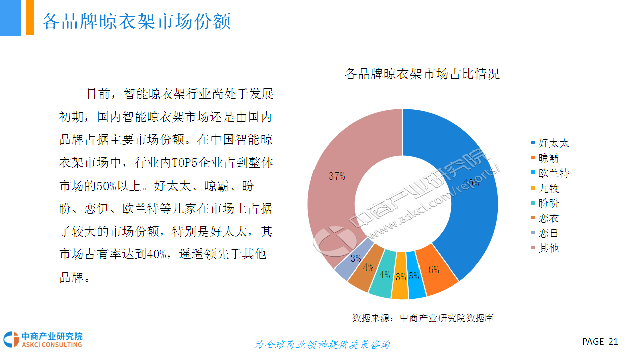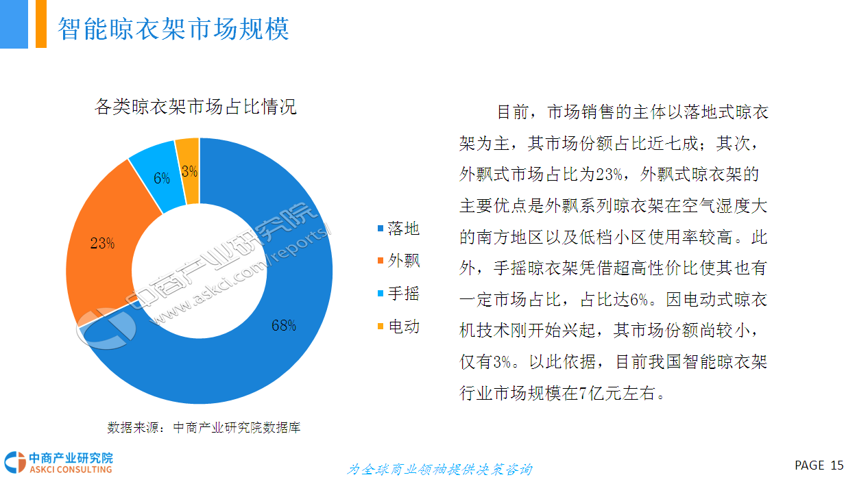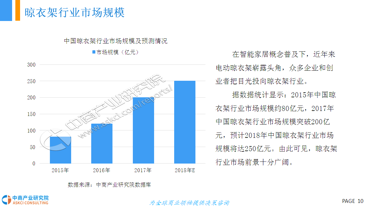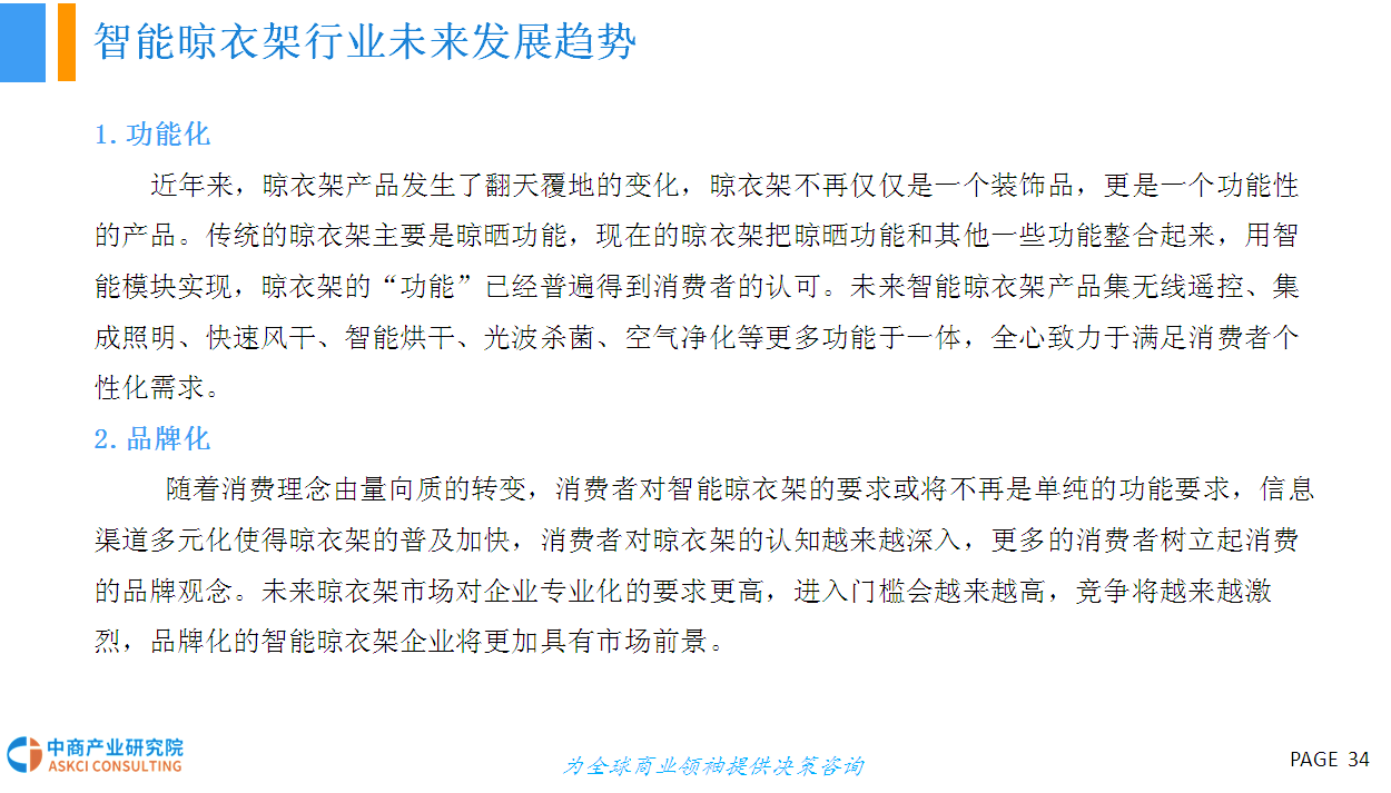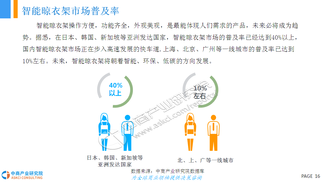 智能晾衣架操作方便,功能齐全,外观美观,是最能体现人们需求的产品,未来必将成为趋势。据悉,在日本、韩国、新加坡等亚洲发达国家,智能晾衣架市场的普及率已经达到40%以上,国内智能晾衣架市场正在步入高速发展的快车道.上海、北京、广州等一线城市的普及率已达到10%左右。未来,智能晾衣架将更智能化、品牌化、市场规模进一步扩大!