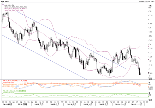 上周五,澳元横向整理之后继续大幅创出新低。日线图上看,汇价重新跌穿均线系统,下跌势头十分迅猛。4小时图,K线连续收阴,0.7200的支撑被跌破之后,下方空间被进一步打开。小时图,空头动能占据明显的优势,短线主次节奏明显向下。目前0.7020是关键的支撑水位,若该水位不保则0.70这个长期的坚硬支撑闸口将要遭到考验,日线图上各项技术指标均进入极度超卖状况,而且考虑接近年底市况清淡,料澳元再创新低的可能性不大,上方0.71附近有多头澳元的头寸再坚持一下,总之0.70破位后则坚决止损。