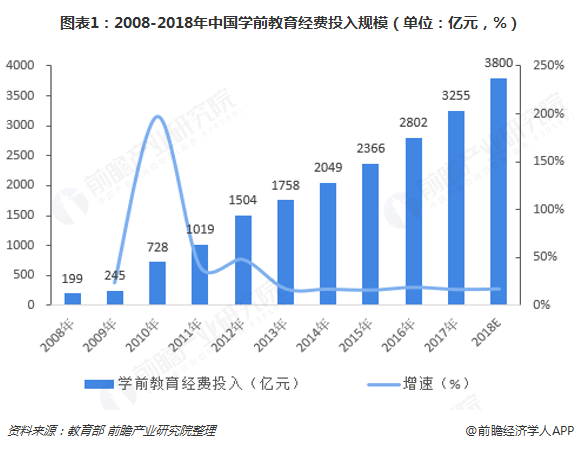 近年来,为了使全国适龄儿童得到适当的学前教育,提高学前三年毛入园率和普惠性幼儿园覆盖率,国家加大了对学前教育经费投入。2008年全国学前教育经费投入仅为199亿元,至2017年上升至3255亿元,十年间增长了15倍多,年复合增长率达36.4%。预计2018年全国学前教育经费投入将超过3800亿元。