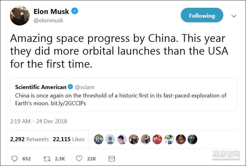 24日,马斯克在推特上转发了《科学美国人》杂志的有关我国探月工程[url=]嫦娥四号[/url]探测器成功发射的文章,并评论道:“中国在太空方面的进步令人惊叹,今年他们完成的轨道发射数量首次超过了美国。”