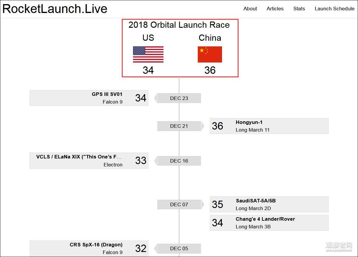 而观察者网查阅长期跟踪各国火箭发射新闻的RocketLaunch网站发现,在2018年的最后一个星期内,中国还将有2次发射计划,而美国只有1次。这意味着年内美国已经无力反超中国。