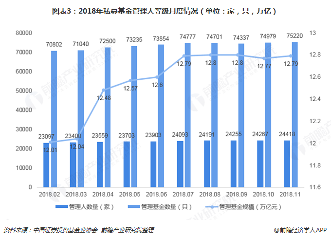 据中国证券投资基金业协会数据统计,截至2018年11月底,协会已登记私募基金管理人24418家,较上月存量机构增加151家,增长0.62%;已备案私募基金75220只,较上月增加241只,增长0.32%;管理基金规模12.79万亿元。