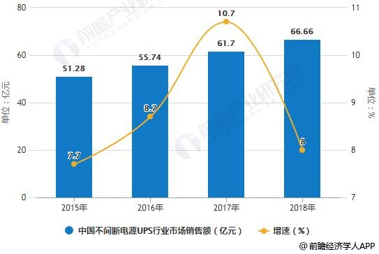 据前瞻产业研究院发布的《中国不间断电源(UPS)行业市场前瞻与投资战略规划分析报告》统计数据显示,2015年中国不间断电源(UPS)行业市场销售额已达51.28亿元,同比增长7.7%。到了2016年中国不间断电源(UPS)行业市场销售额达到55.74亿元,同比增长8.7%。截止到2017年中国不间断电源(UPS)行业市场销售额达到了61.7亿元,同比增长10.7%。据前瞻产业研究院测算,预计2018年中国不间断电源(UPS)行业市场销售额将达66.66亿元,同比增长8%。