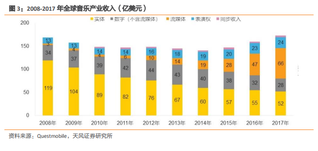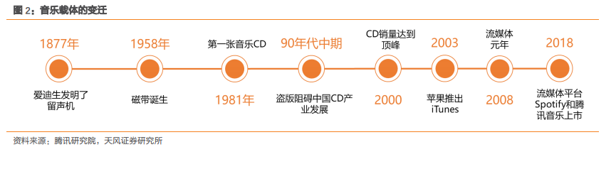 发展历程:从盗版横行到版权大战,监管推动市场发展进程。国内在线音乐历史开始于 2002 年百度上线 MP3 业务为用户免费提供音乐下载服务,紧接着各大在线音乐平台相继成立,包括 2003 年成立的酷狗音乐、2005 年成立的 QQ 音乐和酷我音乐、2006 年成立的虾米音乐和 2008 年成立的天天动听等;这一时期由于版权不够规范,平台鲜少向上游支付音乐版权费用,所有的音乐用户均能免费听甚至将歌曲下载到本地,因而平台只能依靠广告、游戏等方式实现流量变现。