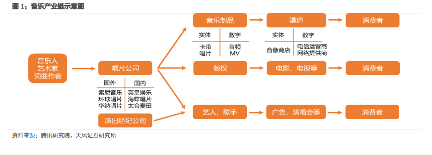 整合历程:CMC 和腾讯合并,市场格局收拢。以腾讯音乐为代表的国内音乐平台近年经历大规模整合,市场格局收拢。2003 年在线音乐平台纷纷成立,腾讯 QQ 也开始为用户提供在线音乐服务,并于 2005 年正式推出 QQ 音乐。2004 年,酷狗音乐上线,2005 年酷我音乐上线,2012 年酷狗直播(原繁星直播)上线,2013 年酷我聚星上线,2014 年腾讯上线全民 K 歌。至此,腾讯、北京酷狗及广州酷我均在音乐业务上完成初步布局,并形成了“在线音乐+社交娱乐”的多元化盈利模式。