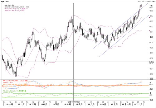 加币跟原油价格相关性很高,油价不见底恐怕加币也难见出头之日。另一方面,在加拿大央行进一步加息空间有限的情况下,逢高做空加元乃明智之举。技术图上,美/加日线图自1.2062展开上涨波浪,目前已过三浪,但动能仍充足。指标方面RSI向上,MACD双线零轴以上金叉且红色动能柱扩张,操作上建议介入美/加多头,上不设目标,关注原油是否反弹,止损放1.35
