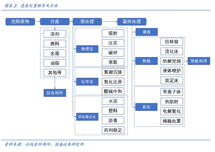 处置工艺分门别类,技术壁垒较高。根据危废的有害特性,相应的处置工艺也不同。1、腐蚀性废物应先通过中和法进行预处理,然后再采用其他方式进行最终处置;2、有毒性废物可选择解毒处理,也可选择焚烧或填埋等处置技术;3、易燃性废物宜优先选择焚烧处置技术,并应根据焚烧条件选择预处理方式;4、反应性废物宜先采用氧化、还原等方式消除其反应性,然后进行焚烧或填埋等处置;5、感染性废物(医疗废物)应选择能够杀灭感染性病菌的处置技术,如焚烧、高温蒸汽灭菌、化学消毒、微波消毒等。