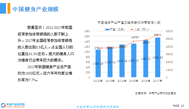 随着我国人民健身意识的进一步提升和健身房商业模式的进一步成熟,我国健身产业发展迅速。2016年体育总局与国务院分别颁布《体育发展十三五规划》、《全民健身计划(2016-2020)》,提出到2020年,每周参加1次及以上体育锻炼的人数达7亿,经常参加体育锻炼的人数达4.35亿,体育消费总规模达1.5万亿元等,目标是把全民健身打造成国家名片。2017年全国经常参加体育锻炼的人数达到5.5亿人,占全国人口的比重达41.3%左右,庞大的健身人口为健身行业带来巨大的需求。