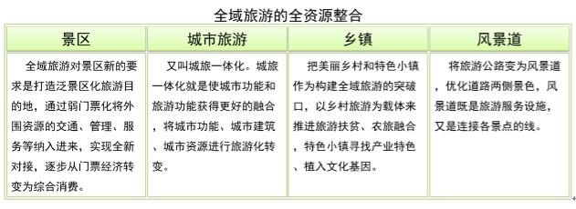 全资源整合是通过全域资源整合,实现全域资源旅游化,扩容资源发展空间。所谓全域资源旅游化,意思是除了传统资源,还要把一些新兴资源挖掘出来,再实现旅游化,从而扩展旅游的发展空间。比如,旅游的核心资源体是景区,但在新兴的资源中,城市、乡镇和风景道都可作为景区的一部分;此外,广场、公园、博物馆、学校、工厂等社会资源访问点,也都会纳入到未来的旅游产品体系中。