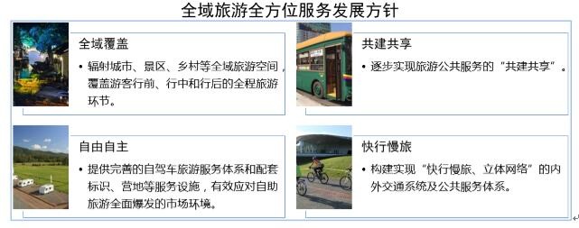 所谓全方位服务,主要还是对游客来讲,不断提升旅游公共服务水平,提供更多的让游客满意的产品。这里面强调“全域覆盖、共建共享、自由自主和快行慢旅”的十六字发展方针。