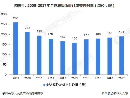受2008年金融危机影响,全球超级游艇订单交付数量出现下滑,直到2014年才开始恢复增长趋势。2014年全球游艇交付总长度增长11.38%至8239米,平均长度也以46.55米创下新高。据不完全统计,2016年的交付数量在185单左右,2017年全球超级游艇交付数量达到191单。