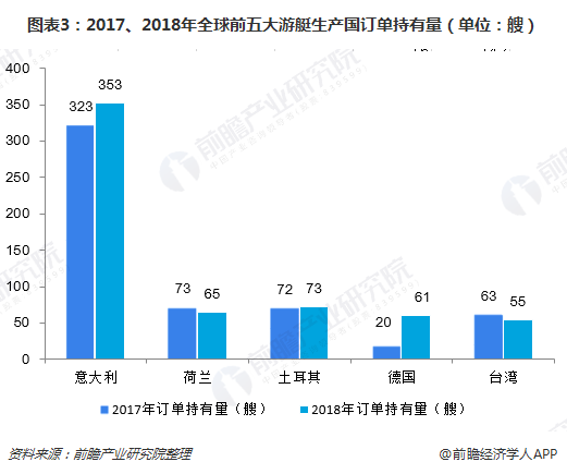 从2017年和2018年全球各国游艇订单持有量情况来看,意大利仍然是全球最大游艇制造国家,2018年度,游艇订单数量达到353艘,订单总长度达到42461英尺,遥遥领先其他国家。全球前五大豪华游艇生产国家和地区依然是意大利、荷兰、土耳其、德国、台湾和英国