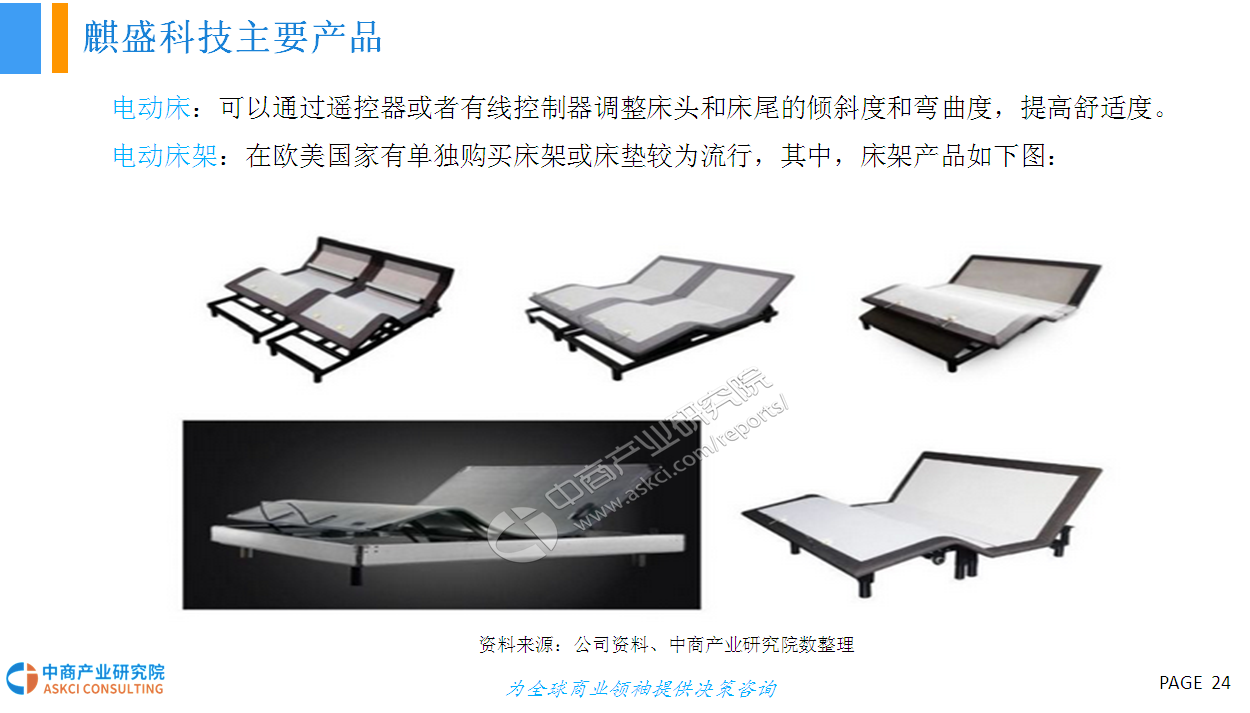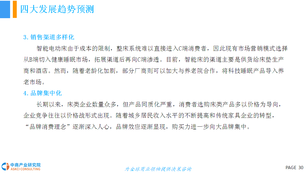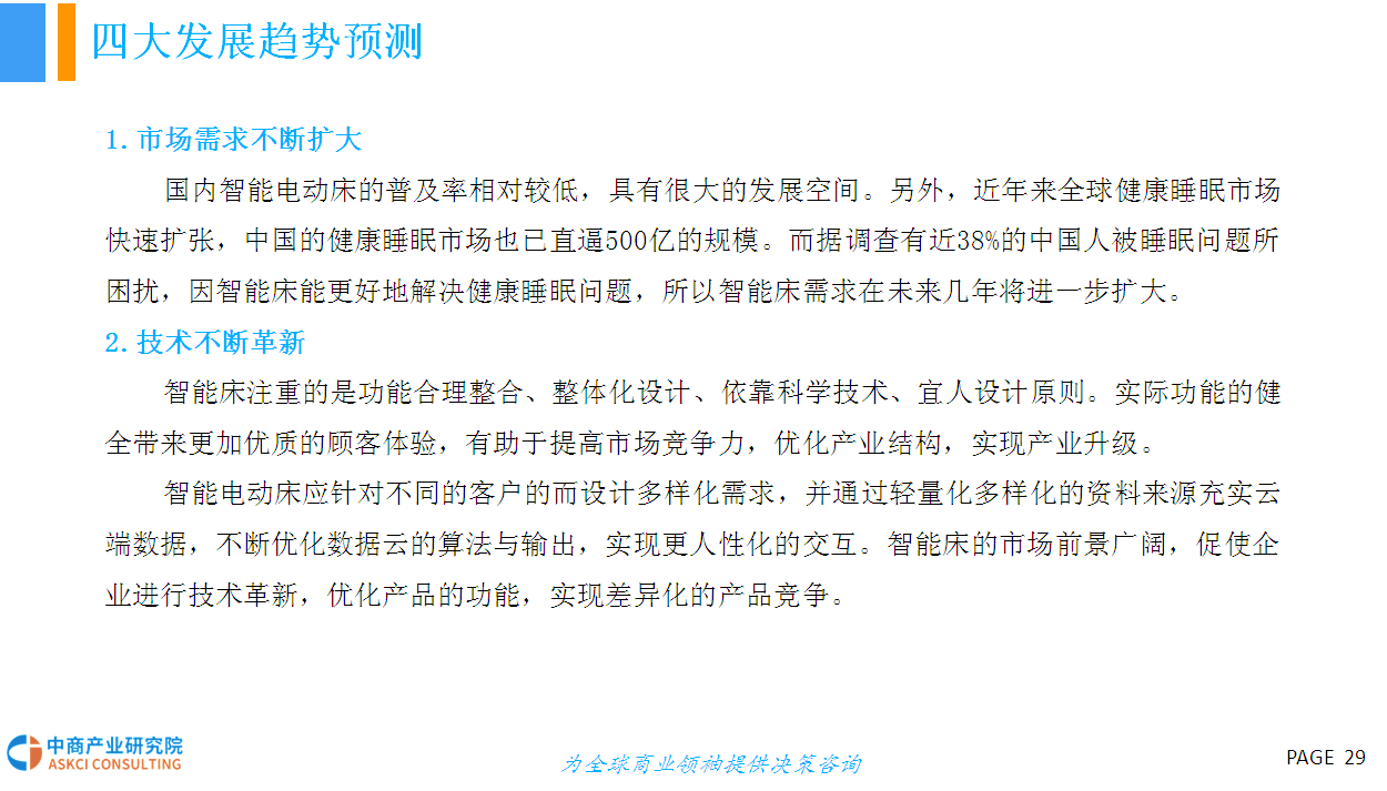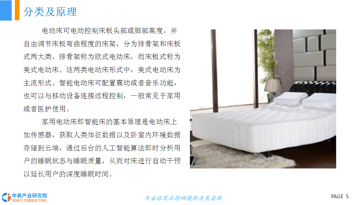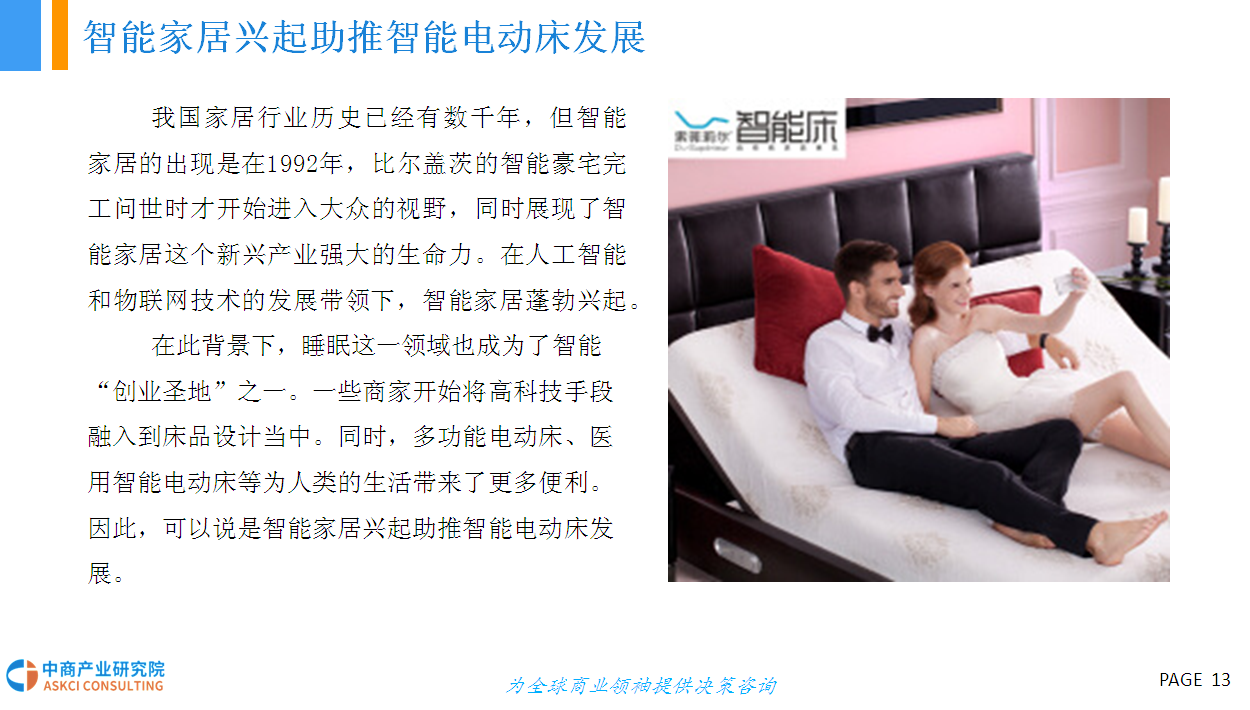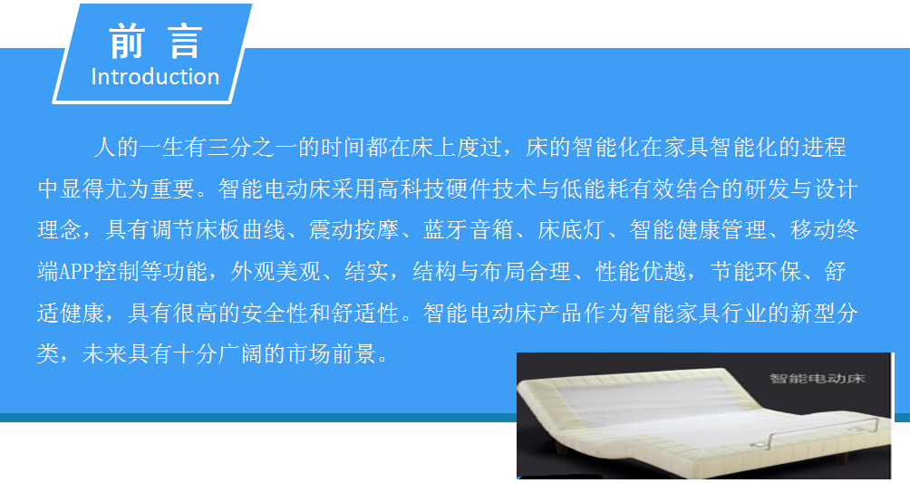 人的一生有三分之一的时间都在床上度过,床的智能化在家具智能化的进程中显得尤为重要。智能电动床采用高科技硬件技术与低能耗有效结合的研发与设计理念,具有调节床板曲线、震动按摩、蓝牙音箱、床底灯、智能健康管理、移动终端APP控制等功能,外观美观、结实,结构与布局合理、性能优越,节能环保、舒适健康,具有很高的安全性和舒适性。智能电动床产品作为智能家具行业的新型分类,未来具有十分广阔的市场前景。