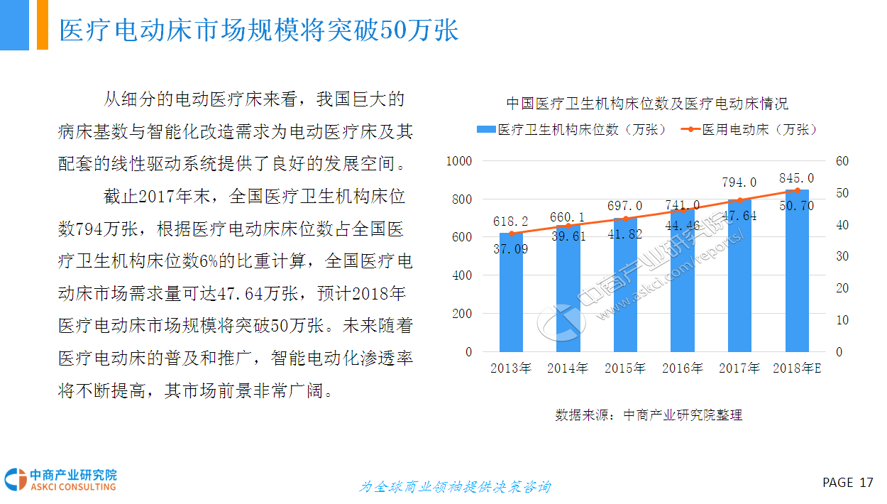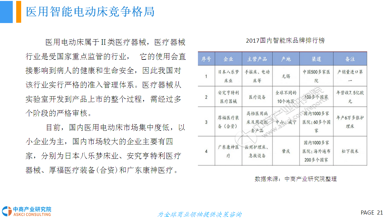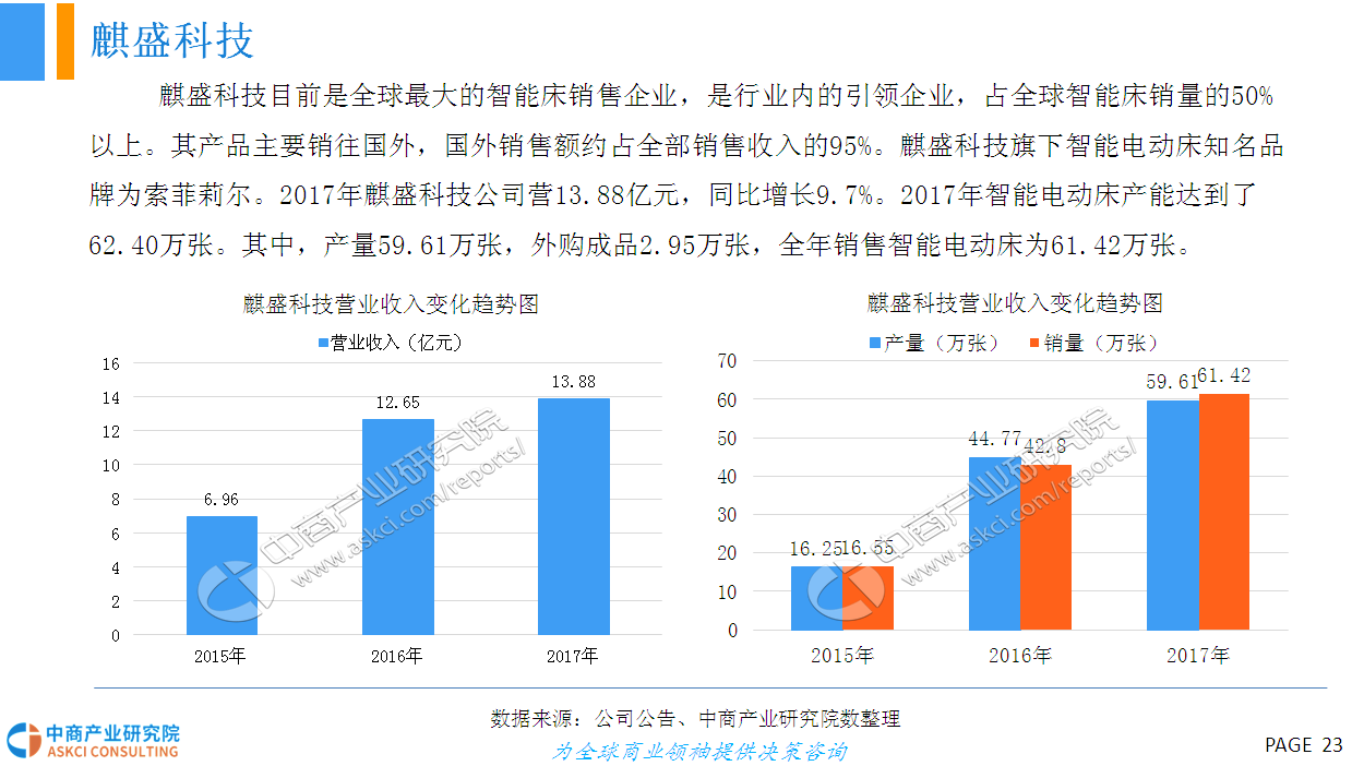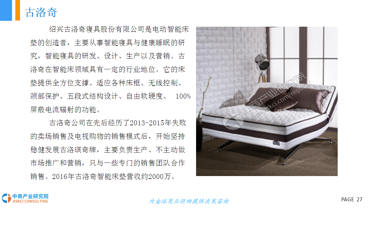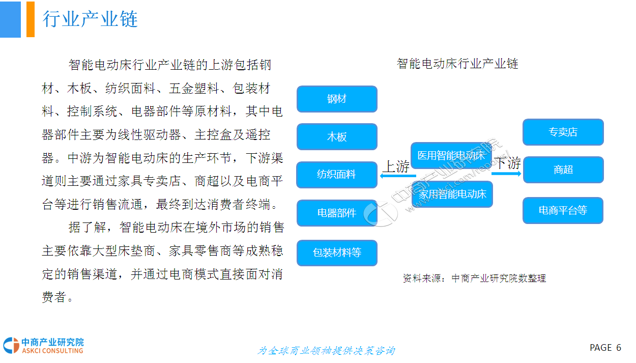 人的一生有三分之一的时间都在床上度过,床的智能化在家具智能化的进程中显得尤为重要。智能电动床采用高科技硬件技术与低能耗有效结合的研发与设计理念,具有调节床板曲线、震动按摩、蓝牙音箱、床底灯、智能健康管理、移动终端APP控制等功能,外观美观、结实,结构与布局合理、性能优越,节能环保、舒适健康,具有很高的安全性和舒适性。智能电动床产品作为智能家具行业的新型分类,未来具有十分广阔的市场前景。