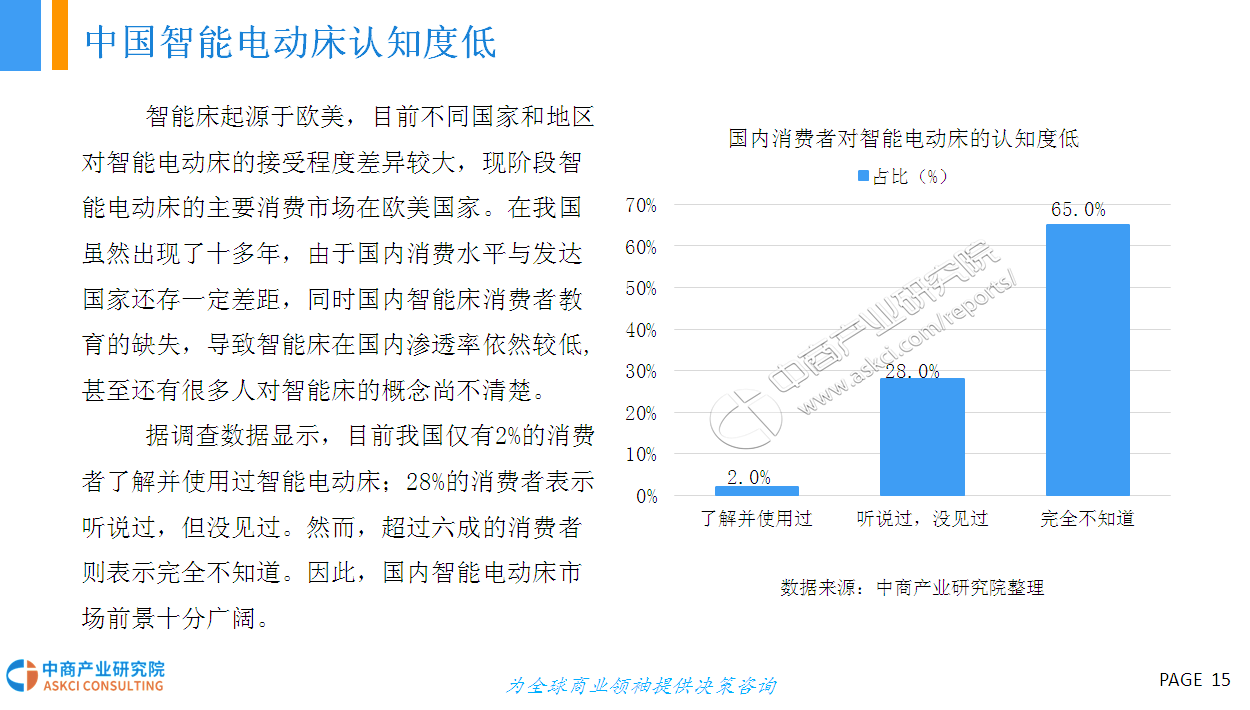 目前不同国家和地区对智能电动床的接受程度差异较大,现阶段智能电动床的主要消费市场在欧美国家。在我国虽然出现了十多年,由于国内消费水平与发达国家还存一定差距,同时国内智能床消费者教育的缺失,导致智能床在国内渗透率依然较低。据调查数据显示,目前我国仅有2%的消费者了解并使用过智能电动床;28%的消费者表示听说过,但没见过。然而,超过六成的消费者则表示完全不知道。