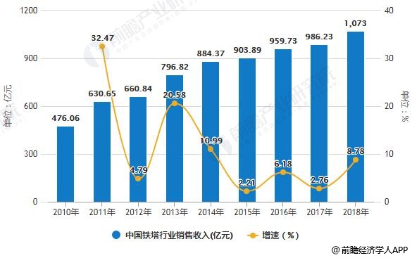 据前瞻产业研究院发布的《中国铁塔行业市场前瞻与投资战略分析报告》统计数据显示,2010年中国铁塔行业销售收入已达476.06亿元。2013年中国铁塔行业销售收入增长至接近8000亿元,同比增长20.58%。到了2015年中国铁塔行业销售收入达到903.89亿元,同比增长6.18%。截止到2017年中国铁塔行业销售收入达到了986.23亿元,同比增长2.76%》预计2018年中国铁塔行业销售收入将突破千亿元。