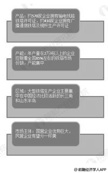 从产品竞争格局来看,目前全国拥有输电线路铁塔许可证的企业在570家左右,拥有广播通信铁塔及桅杆生产许可证的企业在410家左右,主要产品多为各类输电塔和角钢塔。