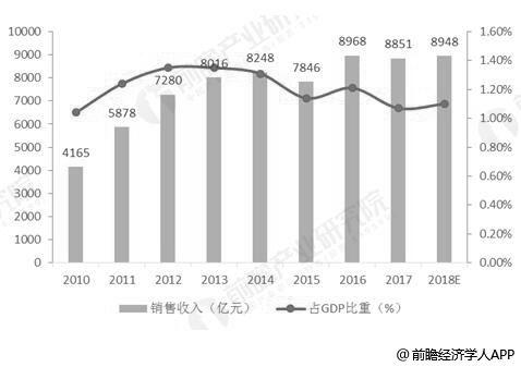 2010-2018年中国铜冶炼行业销售收入及占我国GDP比重统计情况预测