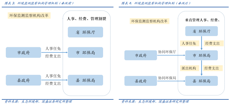 环境监测系统改革推动监测设备市场释放。2015 年起,环境监测管理方式发生改革。2015 起,中央、省市级政府上收环境监测管理权,事权上收后,从体制上实现了“国家考核、国家监测”,能够有效避免监测数据受到行政干扰,保证环保责任考核的客观公正性。同时省市县级的环保监测监察机构实行垂直改革,使得环境监测监察人事任命、经费来源得到保证。