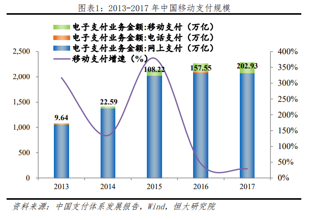 2017 年中国移动支付规模 202.93 万亿,全球排名第一,为美国移动支付规模百倍。2013 年以来,伴随着支付宝、微信支付等第三方移动支付平台的崛起,中国移动支付蓬勃发展。2017 年,中国移动支付规模达202.93 万亿,全球排名第一,近五年移动支付规模平均增速高达 181%,在电子支付业务金额中的占比不断提升,从 2013 年的不足 1%飙升至 2017年的 8.4%。根据 Forrester 报告,2016 年美国移动支付比例仅 1120 亿美元,甚至不足中国的 1%,且增速相对缓慢。