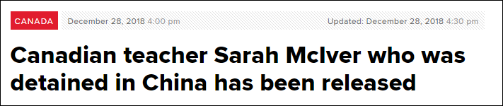 加拿大广播公司(CBC)报道称,一位加拿大全球事务部的发言人在电子邮件中表示,“该部可以证实,本月在中国被拘留的一名加拿大公民已经获释,如今已返回加拿大。”但出于隐私方面的考虑,全球事务部不能透露更多的信息。