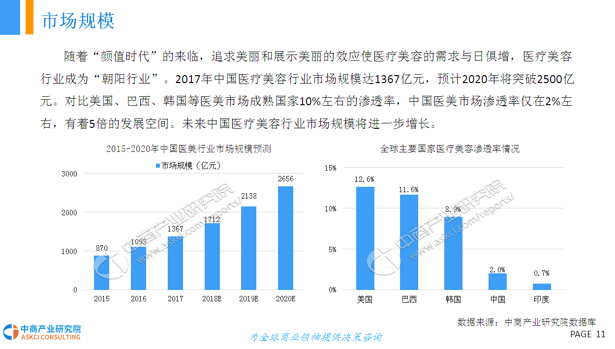 随着“颜值时代”的来临,追求美丽和展示美丽的效应使医疗美容的需求与日俱增,医疗美容行业成为“朝阳行业”。2017年中国医疗美容行业市场规模达1367亿元,预计2020年将突破2500亿元。中国医美市场渗透率仅在2%左右,与医美成熟国家相比,增长空间较大。
