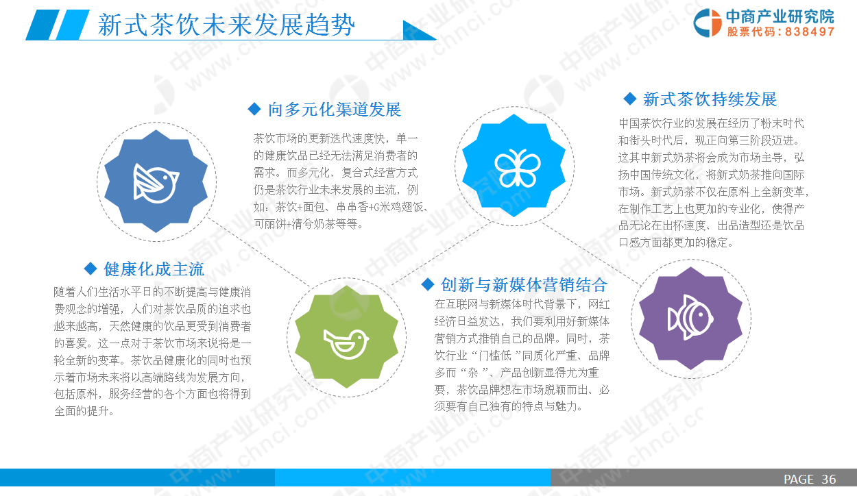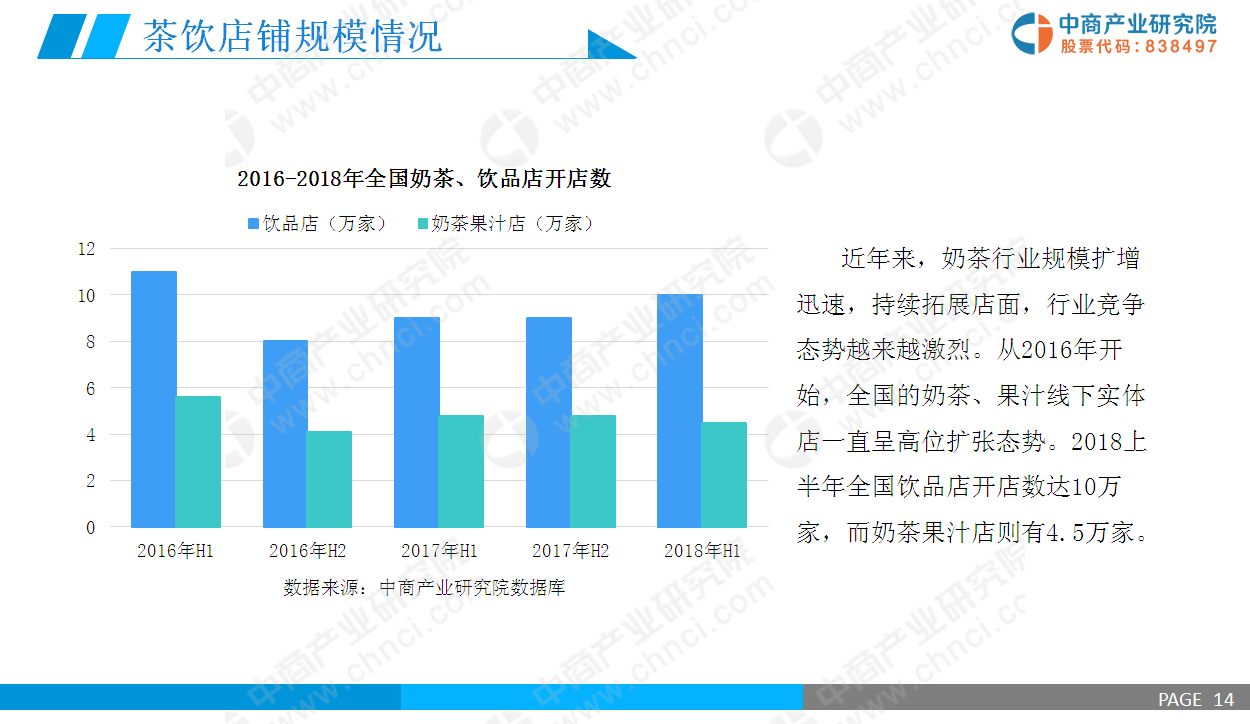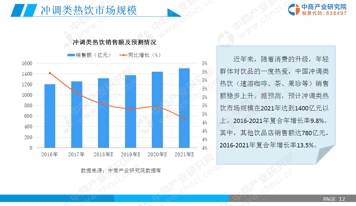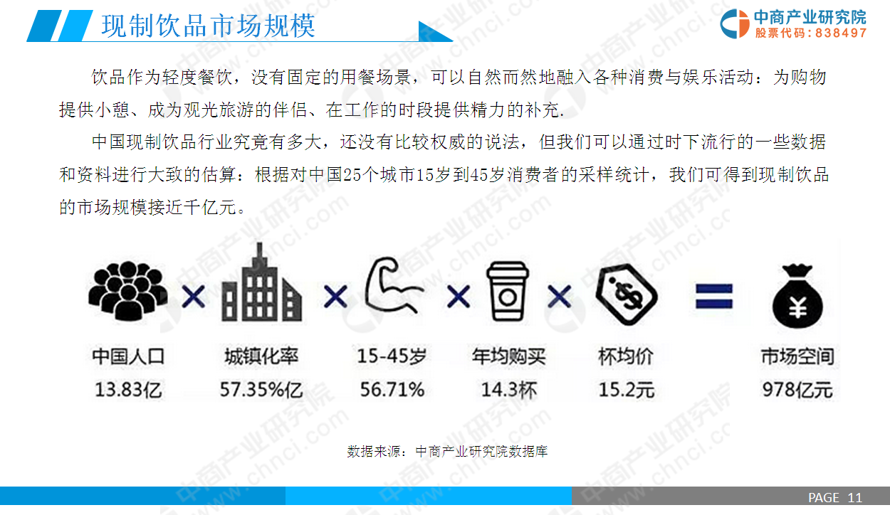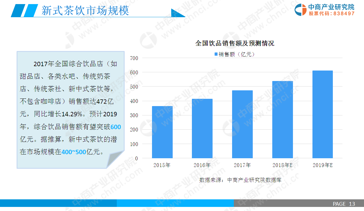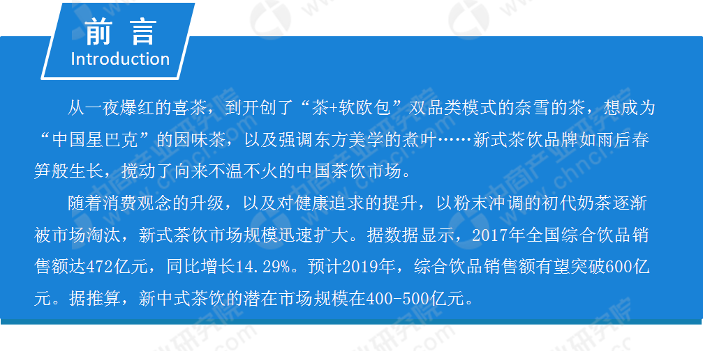 随着消费观念的升级,以及对健康追求的提升,以粉末冲调的初代奶茶逐渐被市场淘汰,新式茶饮市场规模迅速扩大。据数据显示,2017年全国综合饮品销售额达472亿元,同比增长14.29%。预计2019年,综合饮品销售额有望突破600亿元。据推算,新中式茶饮的潜在市场规模在400-500亿元。