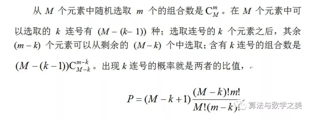 有博文讨论“真随机数”,想到“经适房的六连号”。作为数学问题就是,从M 个元素中随机选取 m 个出现 k 连号的概率(k ≤ m)。 ![]()