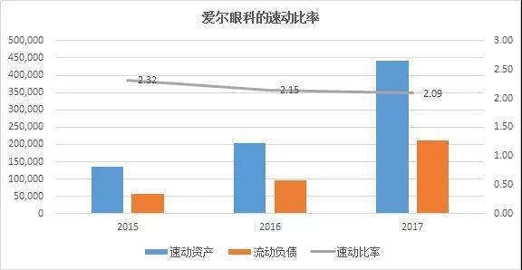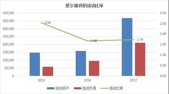 我们发现,在流动性方面,爱尔眼科的流动比率由2015年的2.54倍下降到2017年的1.74倍。速动比率由2015年的2.32倍下降到2017年的2.09倍。这两个指标都表明爱尔眼科在这三年期间资金的流动性减弱。但爱尔眼科的流动资产和速动资产仍然分别是流动负债的1.74倍和2.09倍,这一比率的下降不仅不会引起短期偿债的问题,反而提高了爱尔眼科的资金使用效率。我们认为爱尔眼科不存在流动性的问题,特别是爱尔眼科存在大量富余货币资金的情况下,反而爱尔眼科在财技上十分保守。其实,爱尔眼科的管理层在经营上已经做得十分优秀,对上游的谈判能力很强,过去几年的营运资本一直为负值,这说明公司的营运资本已经不需要继续投入,还可以为企业提供现金。在这种情况下,我们认为爱尔眼科应该加大资金的使用效率,这样资金才能真正的流动起来。