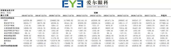 这样,根据以上公式,我们就很容易地计算出爱尔眼科2018年到2028年的无杠杆自由现金流。