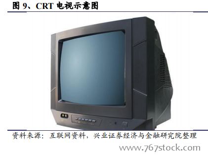 阴极射线管(CRT)显示技术引领了 20 世纪整个显示行业的进展。CRT 电视机是由多个内置一个或多个电子枪的真空管组成的。当电子枪射出的电子束到达真空管前屏幕表面的内侧时,屏幕内侧的发光涂料受到电子束的击打而发光产生图像。CRT 电视机拥有可视角度大、色彩还原度高、响应时间短、生产成本低等优点。1925 年第一台 CRT 电视机的试播开始了 CRT 电视对市场长达八十多年的统治,直到 2009 年 CRT 电视机的市场主导地位才被液晶电视占领。