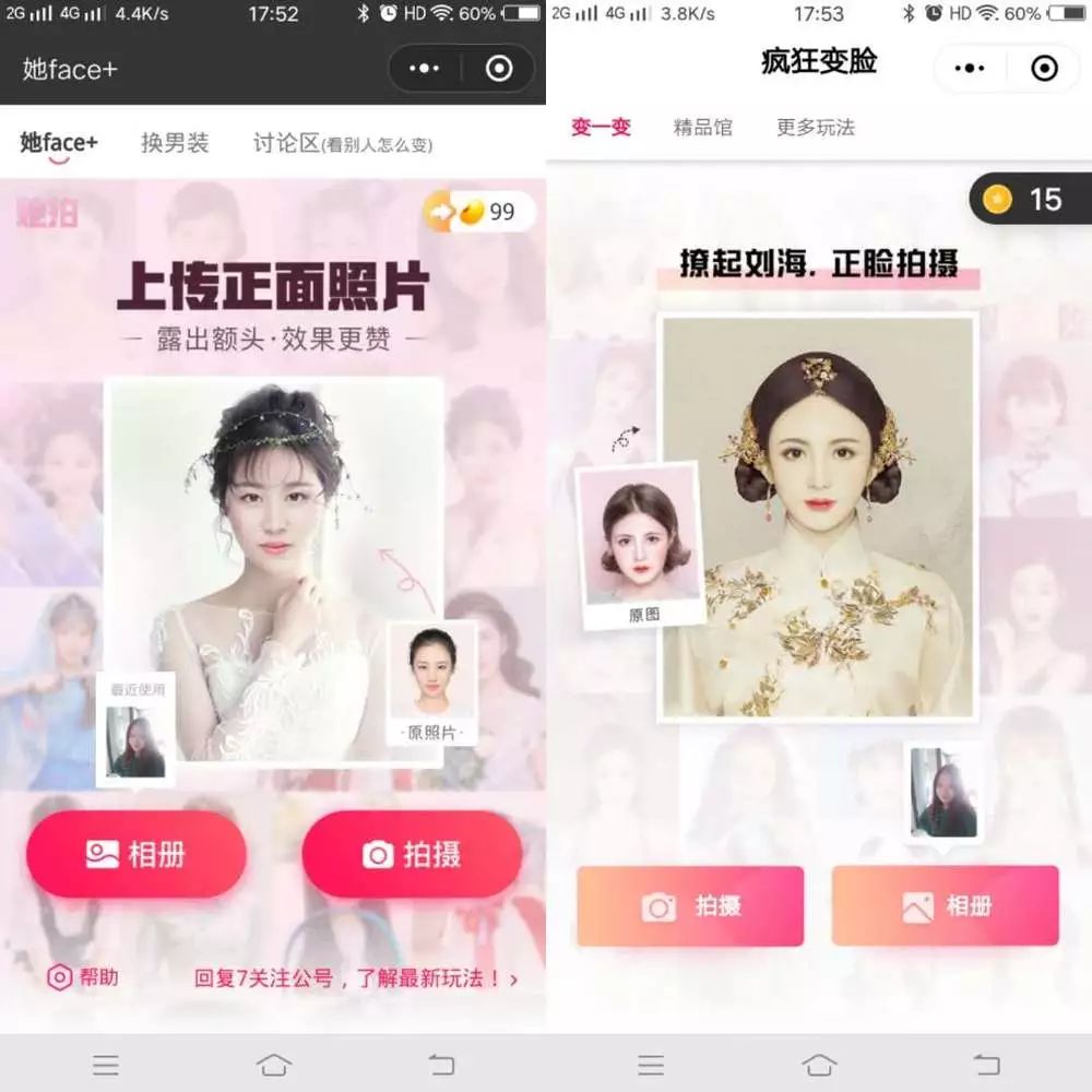 左侧为“她face+”小程序界面,右侧为“疯狂变脸”小程序界面,虎嗅在12月28号截图