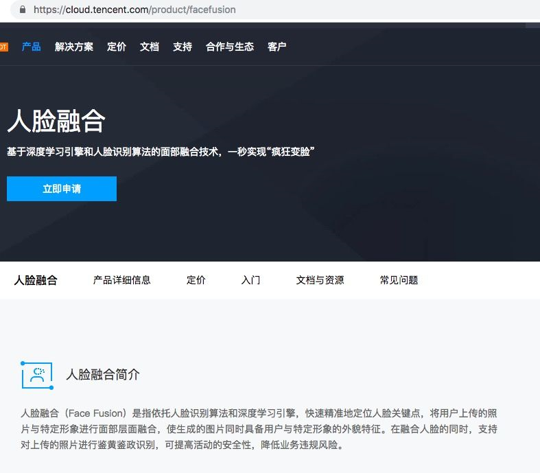 腾讯云官网截图,依据腾讯云官网介绍,人脸融合技术是指指依托人脸识别算法和深度学习引擎,快速精准地定位人脸关键点,将用户上传的照片与特定形象进行面部层面融合,使生成的图片同时具备用户与特定形象的外貌特征。