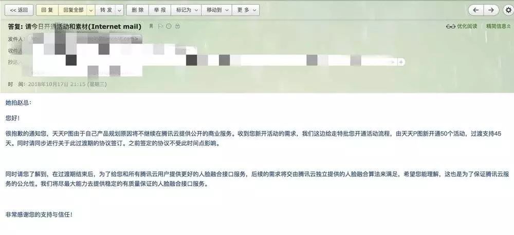 10月17日,腾讯云正式向她拍发送邮件,称给45天过渡期,之后天天P图不再提供技术支持