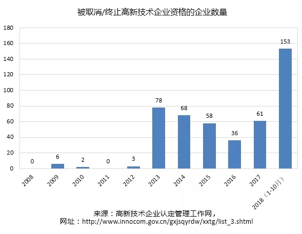 在高新技术企业检查或主管机关的日常管理中,一些企业“落马”,不仅被取消了高新技术企业资格,还被税务机关追缴税款、征收滞纳金甚至处以罚款。尤其值得注意的是,2018年被取消高新技术企业资格的企业数量飙升,仅江苏一地在2018年9月就取消了89家企业的资格。下表总结了自2008年起至今被取消或终止高新技术企业资格的企业数量。