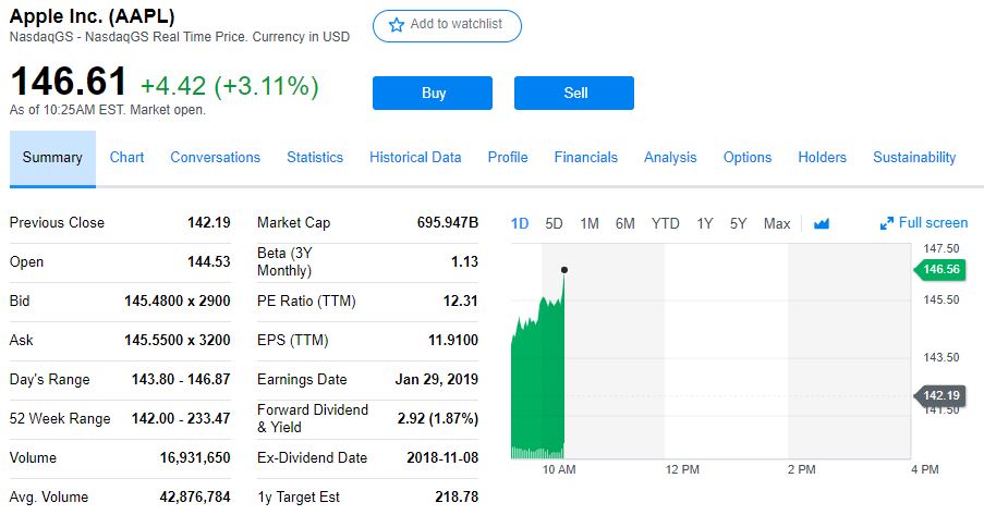 2019年首个交易日就意外下调重要节日购物季财报指引的苹果公司,周四切实“吓坏”了全球市场。周五美股午盘前股价大反转,涨超3%,股价重回146美元上方。周四苹果一度大跌10%,创近六年来最大单日跌幅,也令“股神”巴菲特旗下的伯克希尔-哈撒韦公司账面损失近38亿美元。