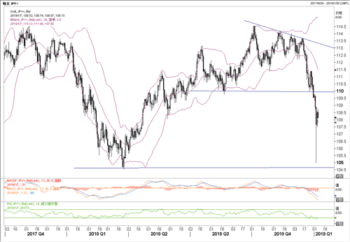 美国总统特朗普周末发飙,再度威胁可能宣布国家紧急状态,以绕开国会达到修建边境墙的目的。众所周知,修建边境墙乃特朗普竞选时的主要承诺之一,但民主党拒绝为此拨款,才令特朗普出此下策。这会带动市场避险情绪,但宣布紧急状态的概率极低。技术面,日线图出现一条超长下影线,维持之前建议空单减仓或离场,激进者可轻仓介入多单,目标109.5,止损108。