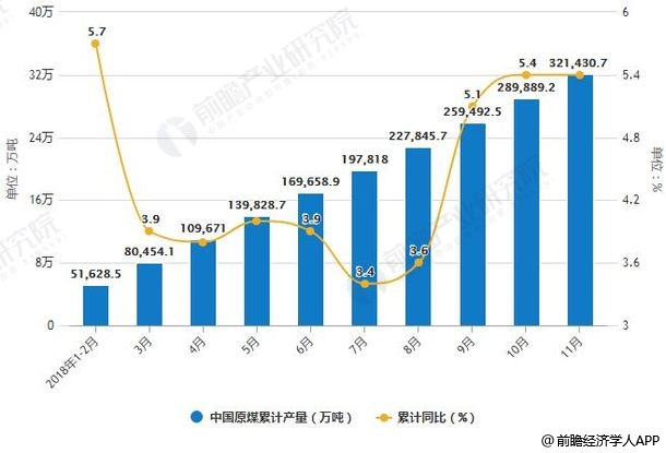 据前瞻产业研究院发布的《中国煤炭行业发展前景与投资战略规划分析报告》统计数据显示,2018年1-3季度全国原煤产量波动幅度较小,整体基本呈稳定状态。2018年11月全国原煤产量为31541.5万吨,同比增长4.5%。比上月回落3.5个百分点,日均产量1051万吨,达到2015年12月以来最高水平。累计方面,2018年1-11月全国原煤产量为321430.7万吨,同比增长5.4%。