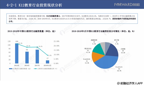 对于从业者来说,据前瞻产业研究院统计,2016-2018年5月,K12教育行业以PreA/A/A+阶段的融资为主,融资数量达到62起,占比39.7%,即投资者偏向于投资起步阶段的公司,模式创新的创业公司显然更受投资者欢迎。