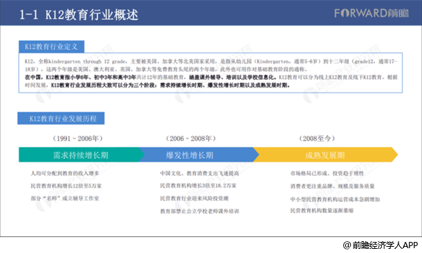 报告认为,我国K12教育行业发展历程大致可以分为三个阶段:1991年到2006年为需求持续增长期,这一时期民营教育机构增长12倍至5万家,部分“名师”成立了辅导工作室;2006年至2008年为爆发性增长期,民营教育机构高速增长至18.2万家,行业迎来风险投资潮;而自2008年至今,K12教育行业进入成熟发展期,市场格局已经形成,中小玩家受运营成本压力,逐渐退场,消费者也更加注重品牌、规模及服务质量。